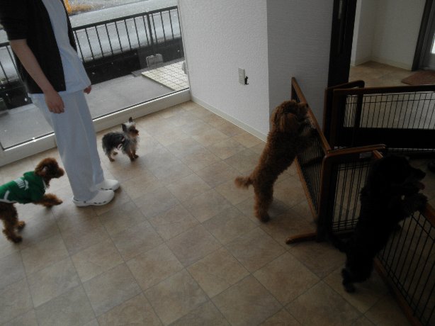 女の子3頭に男の子1頭でした。軽く追いかけたりしている様子が見られましたが、みんな一緒に遊ぶ様子もなく、バラバラに行動していました。まだまだ犬より人が好きなようです。