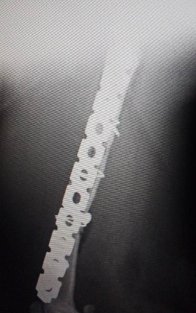 ばらばらになっている骨片を一つ一つ集めて(ラグスクリュー、サークラージワイヤー)大腿骨全域にプレートで固定しました。