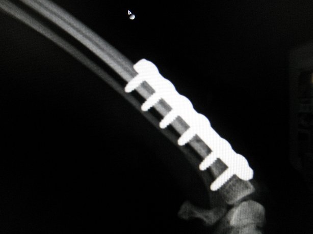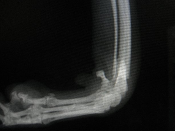 小型犬の橈尺骨はだいたいこの辺が折れます。
